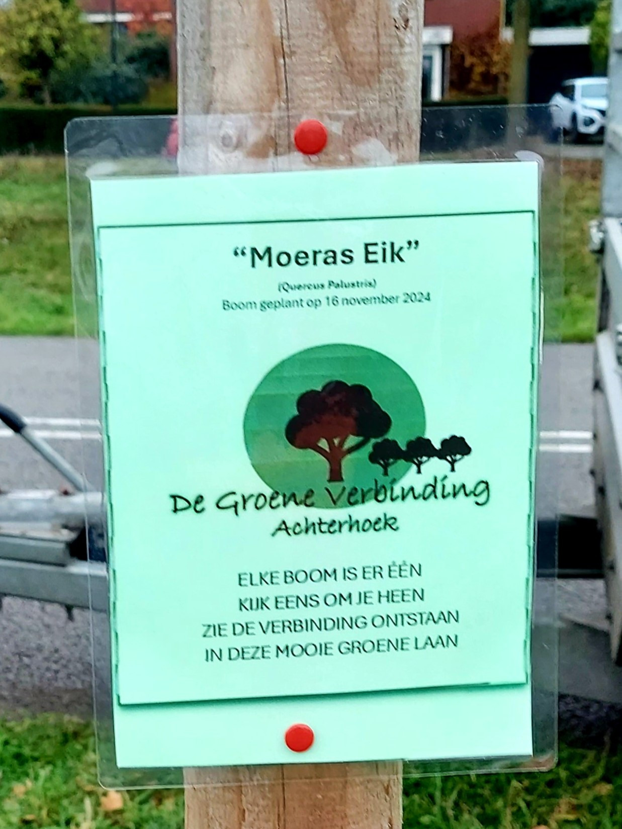 Op 16 november hebben we onze jaarlijkse boom geplant aan de Enkeerdlaan, dit keer een moeraseik.