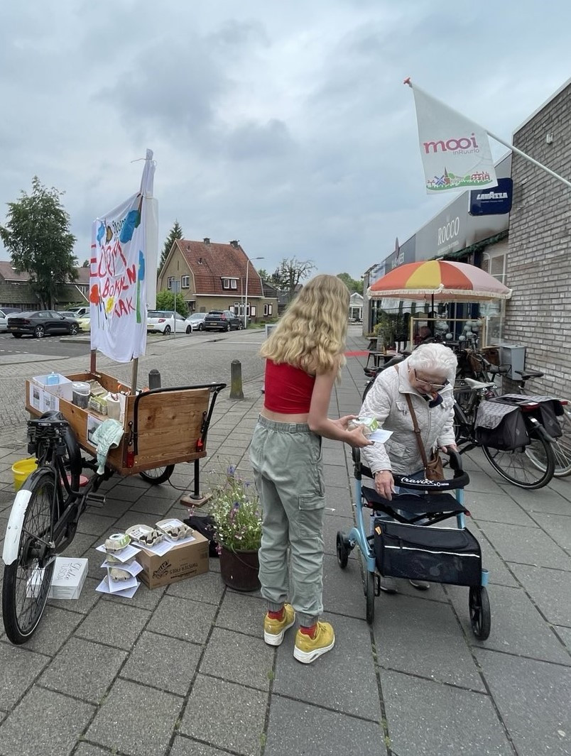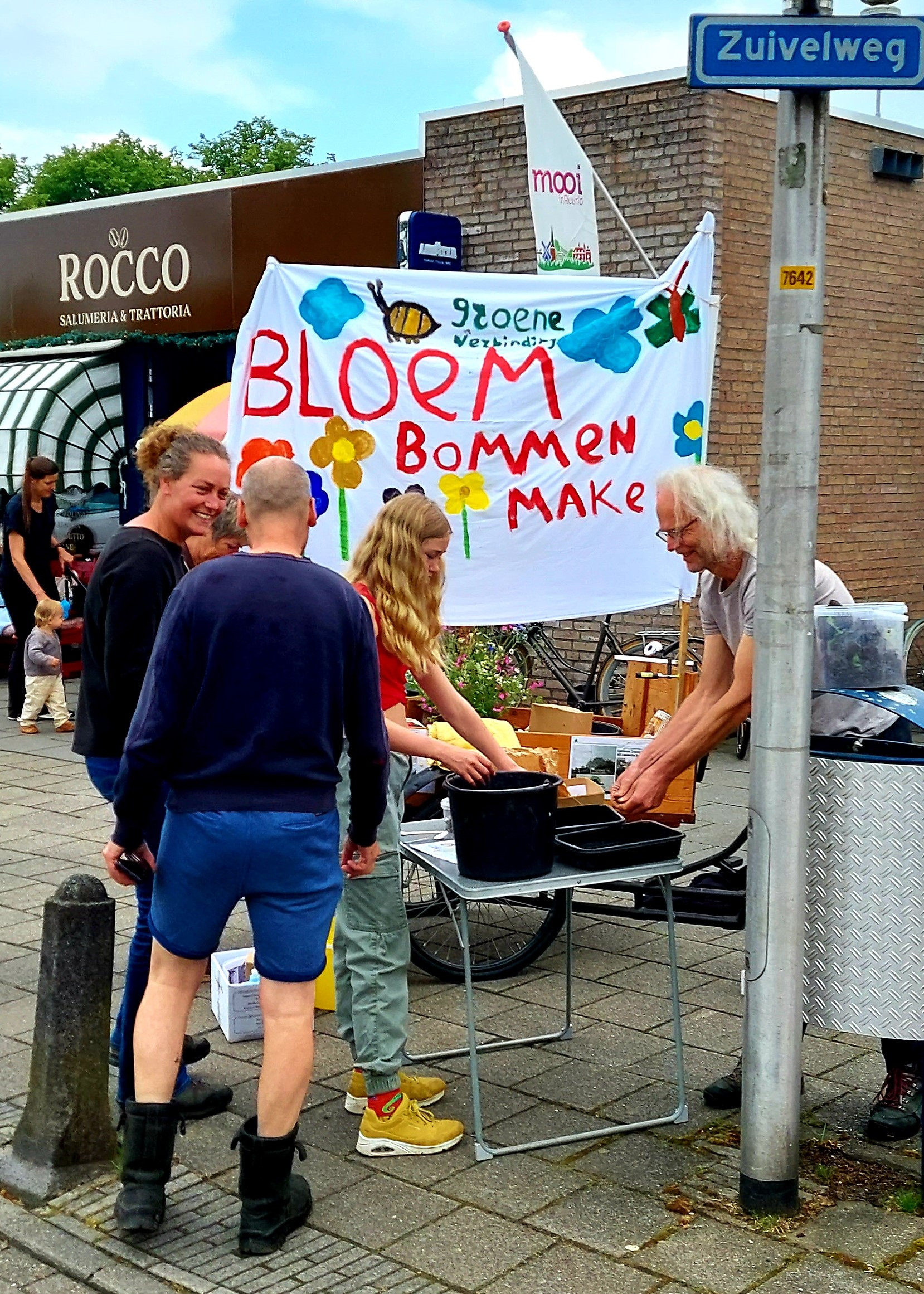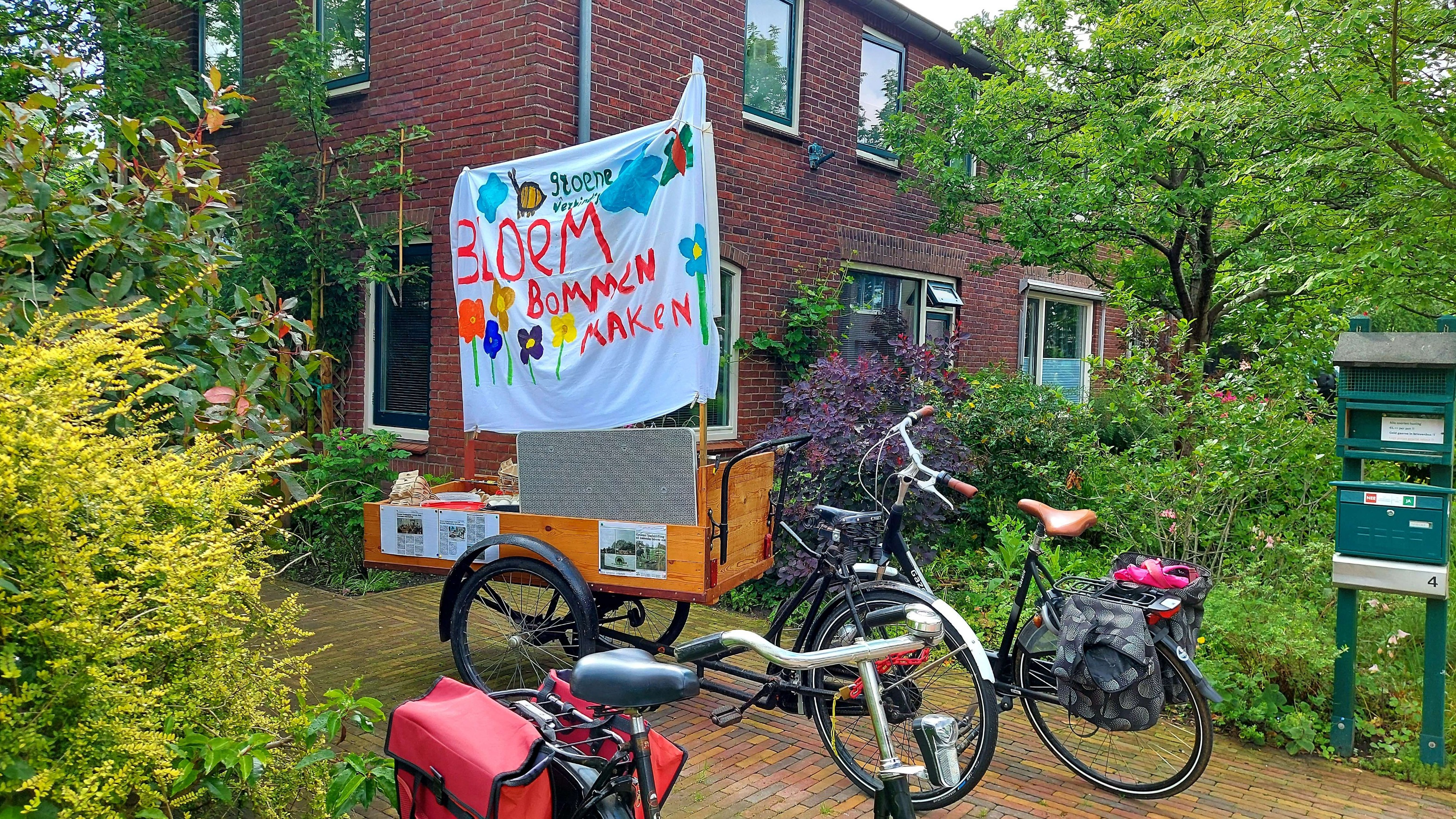 Met het voorjaar in volle gang heeft de Groene Verbinding Achterhoek op deze mooie zaterdag de bakfiets weer volgeladen om groene-mensendingen te doen. Dit maal hebben we het winkelend publiek in Ruurlo ter plekke gefabriceerde “bloembommen” aangeboden. Een bolletje gekneed van tuinaarde, klei en zaadjes dat je als een bommetje op een plek laat vallen waar je kansen ziet voor een klein boeketje bloemen. Met deze actie hebben we mensen en hun groene omgeving weer even met elkaar in contact gebracht. Wat helemaal aansluit bij het doel van de Groene Verbinding!