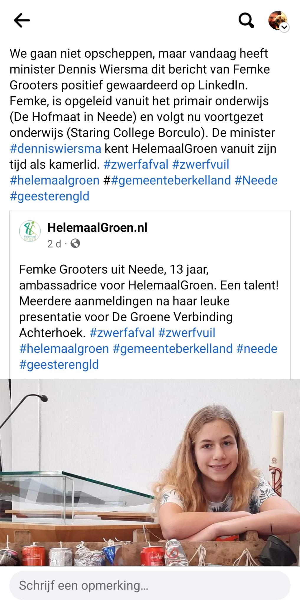 Voorafgaand aan het planten, vertelden Jaap de Boer en Femke Grooters over het terugdringen van zwerfvuil met de app “HelemaalGroen”. Inmiddels gebruiken ruim elfduizend vrijwilligers de app en ruimen al wandelend hun omgeving op. HelemaalGroen wordt door 8 gemeentes ondersteund, waaronder de Gemeente Berkelland.